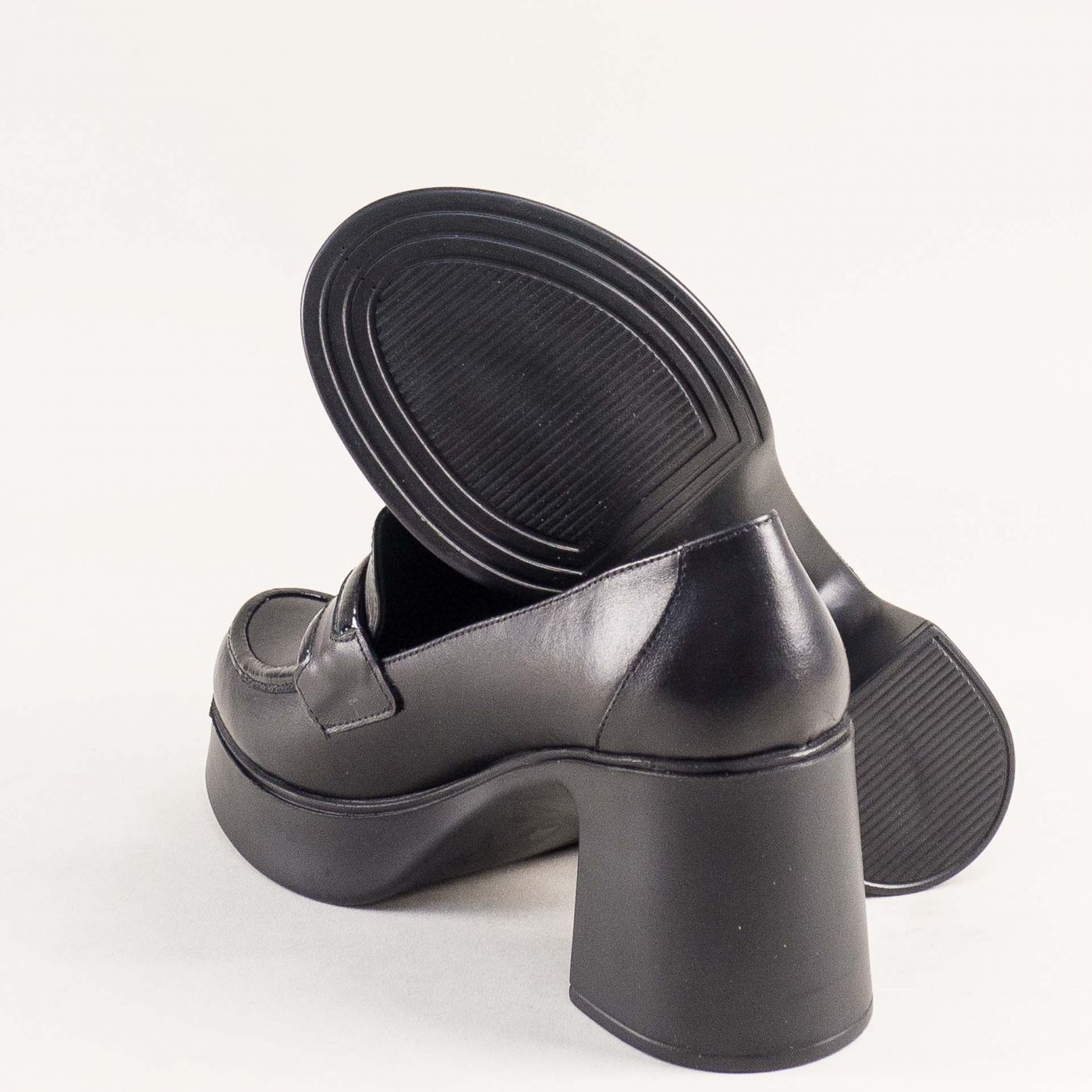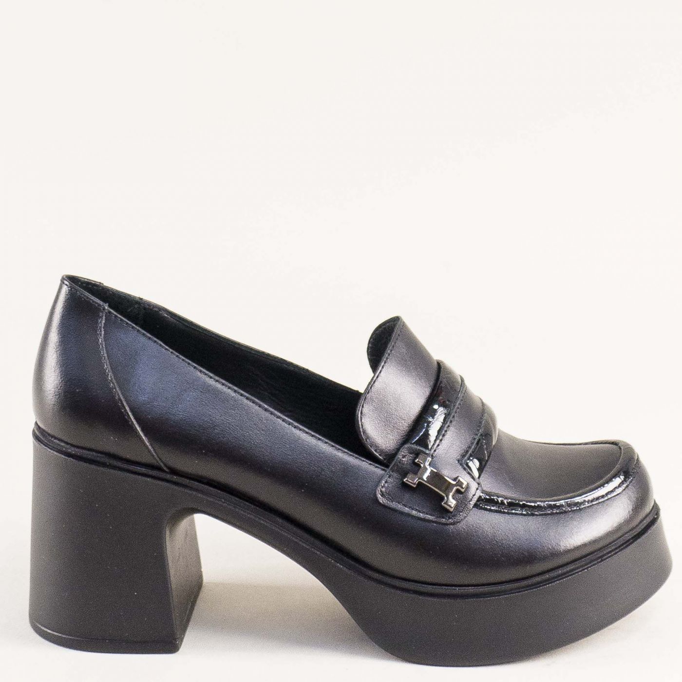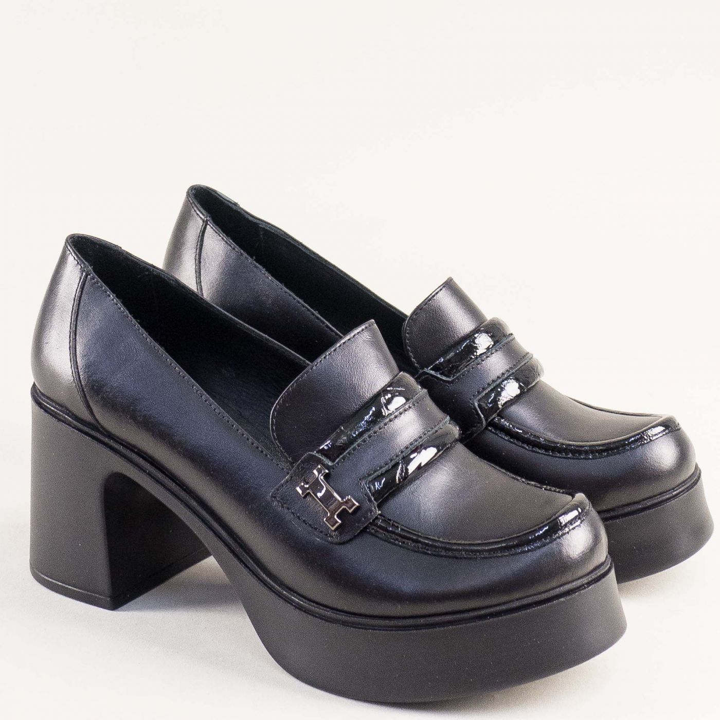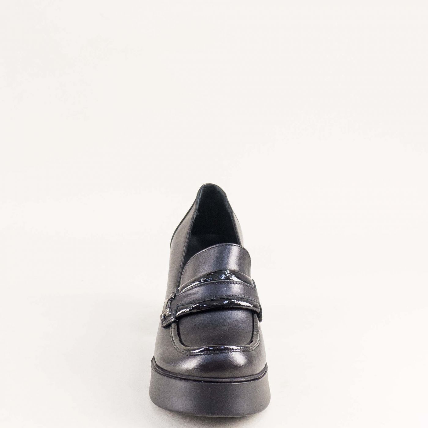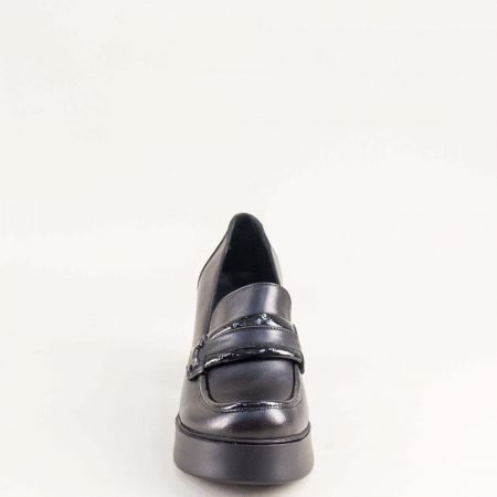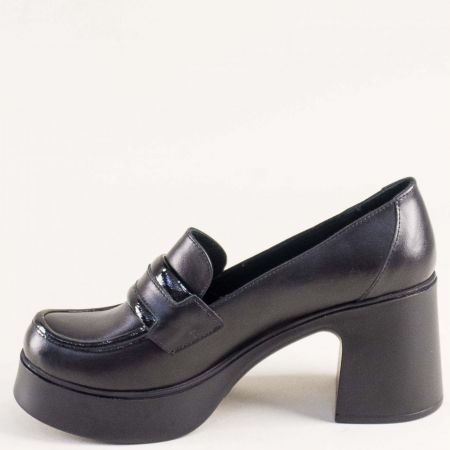Стилни дамски обувки на ток и платформа в черна кожа и лачен детайл mag994ch